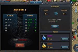 王者传奇转生系统是怎么回事?上古的道士们无意当中发现了转生之法,通过对精元的压缩与再生,可以极大增强体魄,拥有更强的攻击与防御能力。这种转生之法在不断的流传当中,逐渐完善,现已成为每个传奇大陆的勇士必