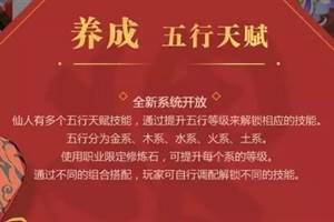 元气封神五行天赋养成系统开放,仙人有多个五行天赋技能,通过五行等级来解锁相应的技能。五行分为金系、木系、水系、火系、土系。使用职业限定修炼石,可提升每个系的等级。通过不同的组合搭配,玩家可自行调配解锁