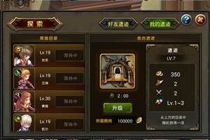 这是玩家之间相互探险险地的地方,在这里玩家双方都可以获取友情点、经验、金币、随机装备等等,玩家还可以升级自己的遗迹提升奖励获取。同时,玩家可以在这里下载欣赏开场动画并了解整个游戏的世界观1、探索好友遗
