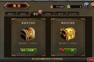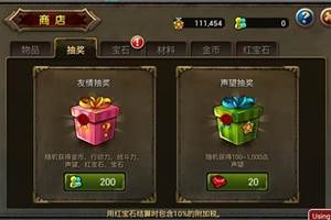 商店分为物品栏、抽奖栏、宝石栏、材料栏、金币栏、红宝石栏;物品栏可以使用红宝石购买补充行动力、补充战斗力,经验加成卡、金币加成卡、10倍加速器,按照时间效益制定道具价格;抽奖栏可以使用玩家互赠行动力获