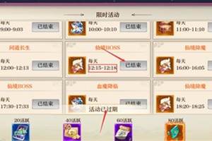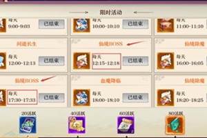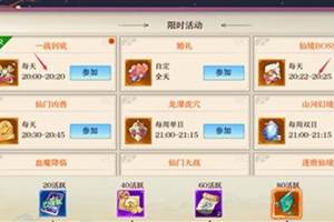 限时活动怎么做呢?限时活动是御剑天下里的一项活动选项,接下来酷乐米小编给大家说说限时活动怎么做1.限时活动是分时间段进行活动,每个时间点的活动都不一样(比如图中每天20点到20点20分能进行一战到底,20点22分到20点25分能进行仙境boss)2.时间过了以后无法参与过了时间点的活动3.但是活动有