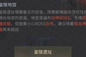 探索皇陵挖宝是获取珍稀装备与资源的高回报活动:首先需备足“探宝洛阳铲”与“避毒丹”等专用道具,通过王城NPC进入皇陵秘境后,建议优先组队清剿守护怪物,再于地图闪烁点使用洛阳铲进行挖掘。注意,深层区域刷新高阶宝箱概率更大,但需警惕其他玩家的争夺。一、皇陵地宫介绍皇陵地宫玩法会在玩家到达100级时开放。