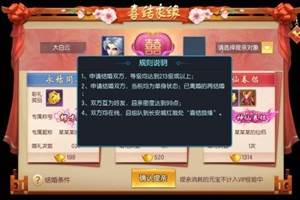 结婚系统介绍结婚是人生大事,游戏中的婚姻也是如此。在《王者西游》里,最浪漫而难忘的一刻,就是和自己的心上人一起携手,步入婚礼的殿堂,结为人人羡慕的伴侣。结婚要求:1.玩家双方等级≥213级;2.双方均