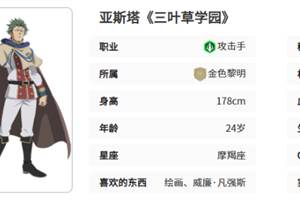 黑色四叶草被赋予不屈的意志称呼的魔导师名字叫做亚斯塔,这是一个ssr品阶的角色,亚斯塔在游戏中是一个背景故事比较叫人心疼的角色,亚斯塔原本是一个孤儿,后来被哈吉村的孤儿院收留抚养长大,长大成人后的他在这个魔法横行的世界中,却是一个没有半点魔力的人,哪怕自身没有任何魔力,可是亚斯塔却始终不放弃成为魔导