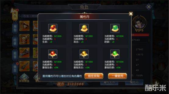 属性丹点击右上角人物头像并点级“属性丹”按钮进入属性丹功能界面游戏内的角色属性丹…