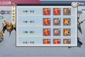 世界BOSS分为上古凶兽和精英BOSS两种一、上古凶兽40-50级BOSS掉落:神铸铁、剑魂碎片、坐骑进阶丹等道具60-90级BOSS掉落:龙门飞甲装备、坐骑战甲装备、觉醒技能书、神铸铁、剑魂碎片等道