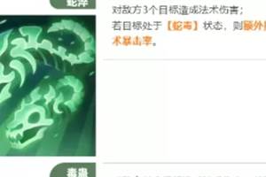 灵兽大冒险青冥大仙这是一只辅助型灵兽,能够降低敌人的治疗,并且自身也拥有不俗的输出能力,这里带来青冥大仙技能分析,下面和酷乐米小编一起来看看吧1.技能完全是为针对治疗单位设计的。2.主动技能“蛇淬”能打敌方3个目标,重点是如果目标挂了“蛇毒”状态,还能额外加法术暴击率,群伤爆发力直接翻倍;3.另一技