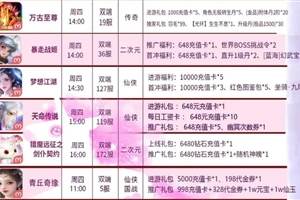 日常活动:点击即可了解活动详情周末累计活动(12.3-12.5)累计10098代金券*1、强化石*200、高级坐骑培养丹*20、随机上古2级普通宝石*10累计200198代金券*1、凡品·1阶随机丹药