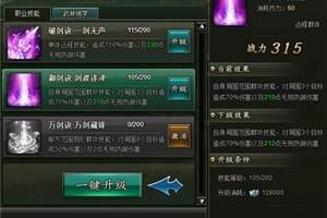 《打天下》职业技能介绍:破剑诀·一剑无声:单体远程技能,对敌人造成百分比伤害以及固定数值的无视防御伤害,随技能等级越高,伤害效果越高。御剑诀·剑渡迷津:自身周围范围群攻技能,对周围3个目标造成百分比伤