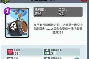 皇室战争中的骷髅气球是一张很有意思的攻城型卡牌,今天小编就为大家带来皇室战争骷髅气球使用细节,一起来了解一下骷髅气球怎么玩吧~【骷髅气球使用细节】卡牌属性解析:这张只需要3费,较为灵活,它的攻击目标是