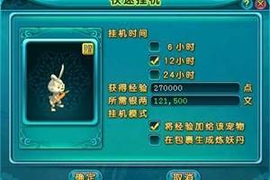 1、在自己的炼妖壶挂宠时,在挂机选择界面增加“快速挂机”功能。2、在别人的炼妖壶挂宠时,“快速挂机”按钮置灰,只保留“普通挂机”功能。3、每只宠物每日有3次机会快速获得经验(包括食用炼妖丹、在炼妖壶快